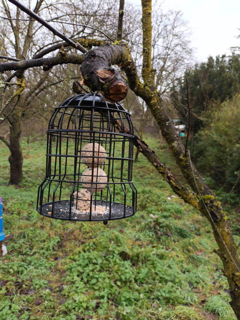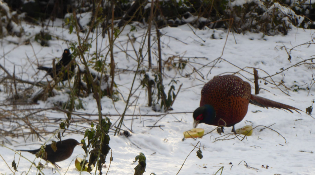Im Winter füttern wir die Vögel im Garten, was lebhaft angenommen wird.